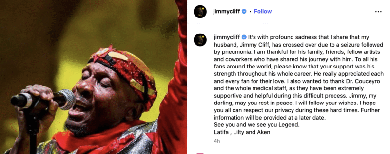 “It’s with profound sadness that I share that my husband, Jimmy Cliff, has crossed over due to a seizure followed by pneumonia. I am thankful for his family, friends, fellow artists and coworkers who have shared his journey with him. To all his fans around the world, please know that your support was his strength throughout his whole career … Jimmy, my darling, may you rest in peace. I will follow your wishes.”